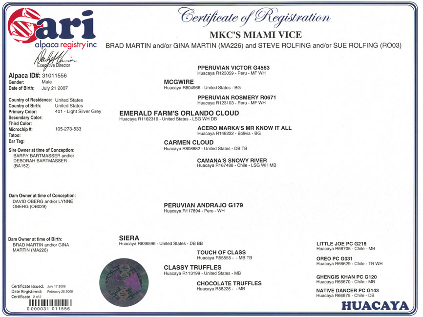 At the 2008 AOBA National Show in Salt Lake City we were on the lookout for a new junior herdsire. MKC Miami Vice caught our eye even before he stood at the head of his class. In winning the AOBA blue ribbon he also won us over. Being an Orlando Cloud son was mere icing on the cake. The fiber on Vice has that elusive but unmistakable “wow” factor that snaps your heart and head into synch. On this guy there’s no ignoring it, and the judges agree – he’s piled up a lot more ribbons since that first day including 2009 Reserve Color Champion at Denver’s Great Western Show, the biggest show last year.