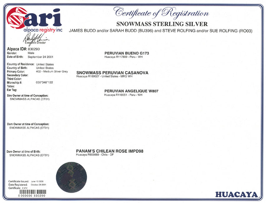 There has never been a more influential grey line than that of Sterling’s sire, Casanova, and Bueno, his grandsire. Bred and proven in the show ring by Snowmass Alpacas, and confirmed by years of fiber testing, Sterling Silver has been judged “the ideal in grey alpaca production.”